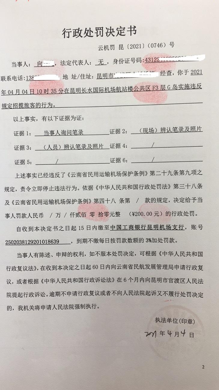 行政处罚决定书 云机罚 昆{2021} (0746)号