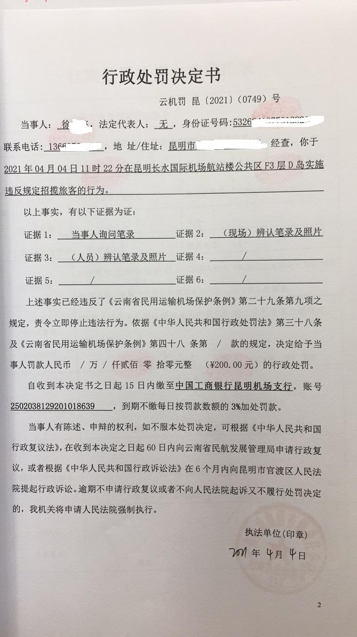 行政处罚决定书 云机罚 昆{2021} (0748)号