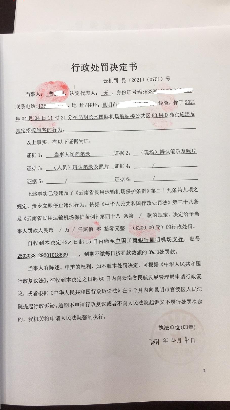 行政处罚决定书 云机罚 昆{2021} (0751)号