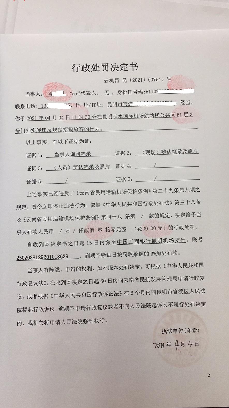 行政处罚决定书 云机罚 昆{2021} (0755)号