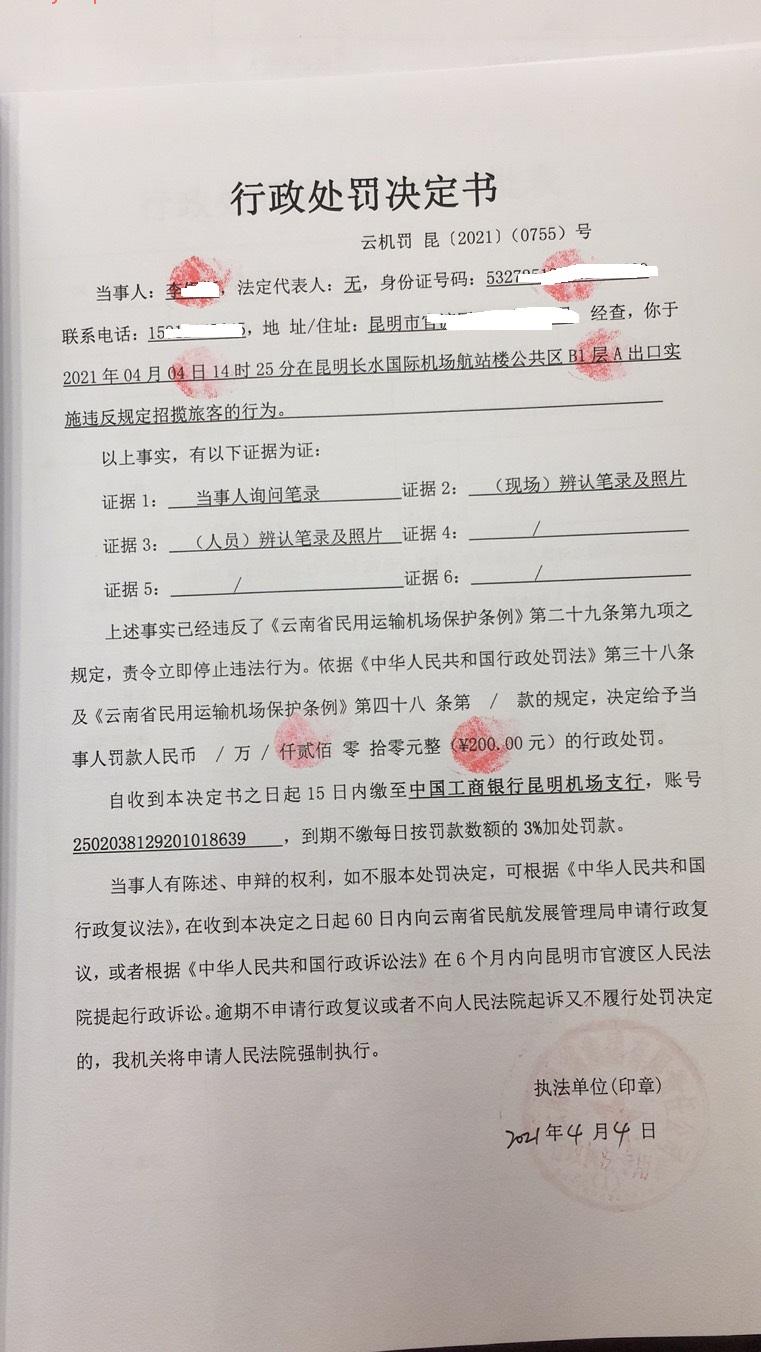 行政处罚决定书 云机罚 昆{2021} (0755)号