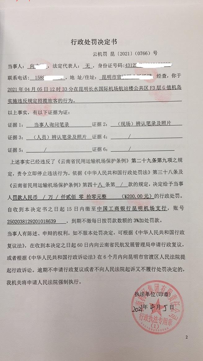 行政处罚决定书 云机罚 昆{2021} (0766)号
