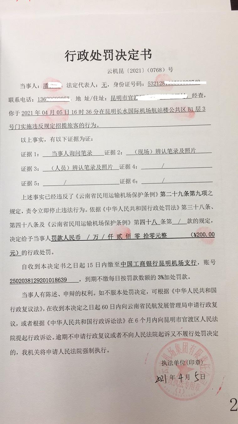行政处罚决定书 云机罚 昆{2021} (0769)号