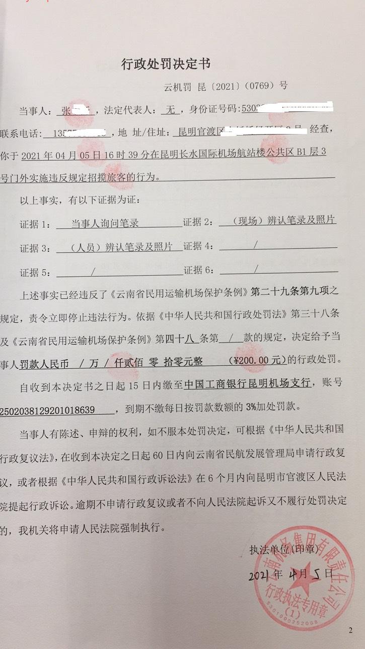 行政处罚决定书 云机罚 昆{2021} (0770)号