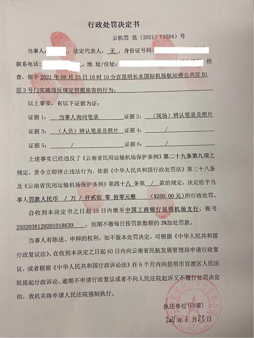行政处罚决定书 云机罚 昆{2021} (1784)号