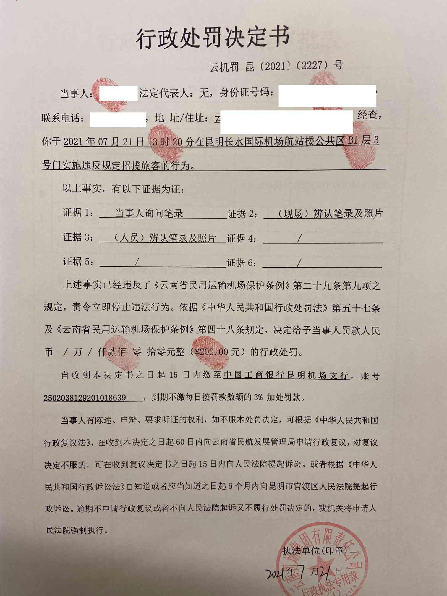 行政处罚决定书 云机罚 昆{2021} (2227)号