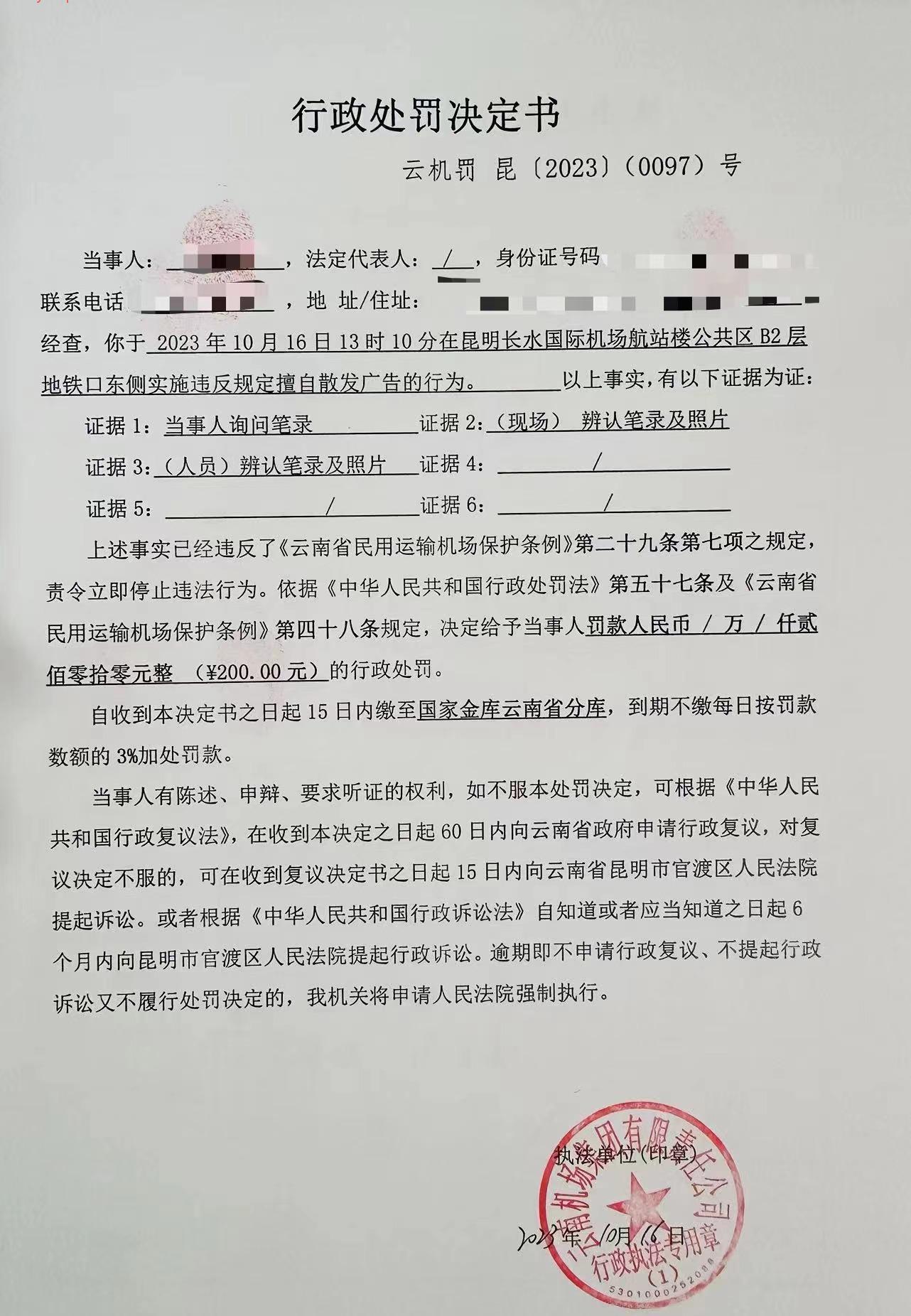 行政处罚决定书 云机罚 昆{2023} (0097)号
