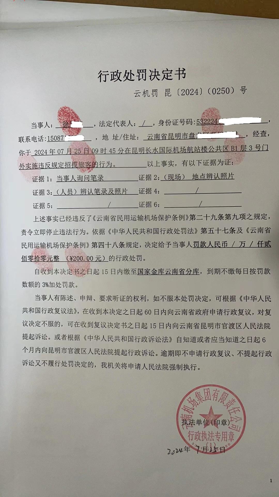 行政处罚决定书 云机罚 昆{2024} (0250)号