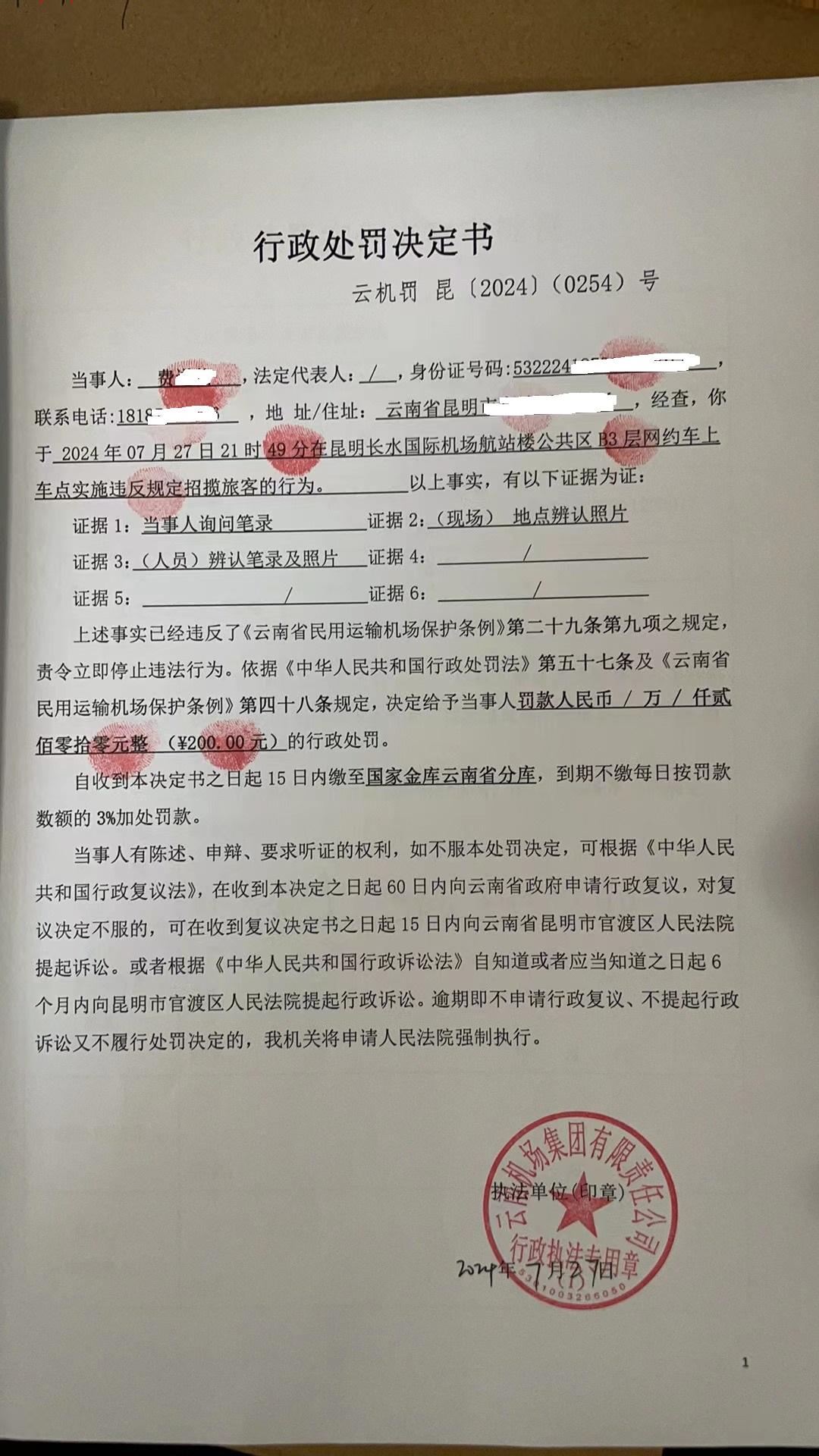行政处罚决定书 云机罚 昆{2024} (0254)号