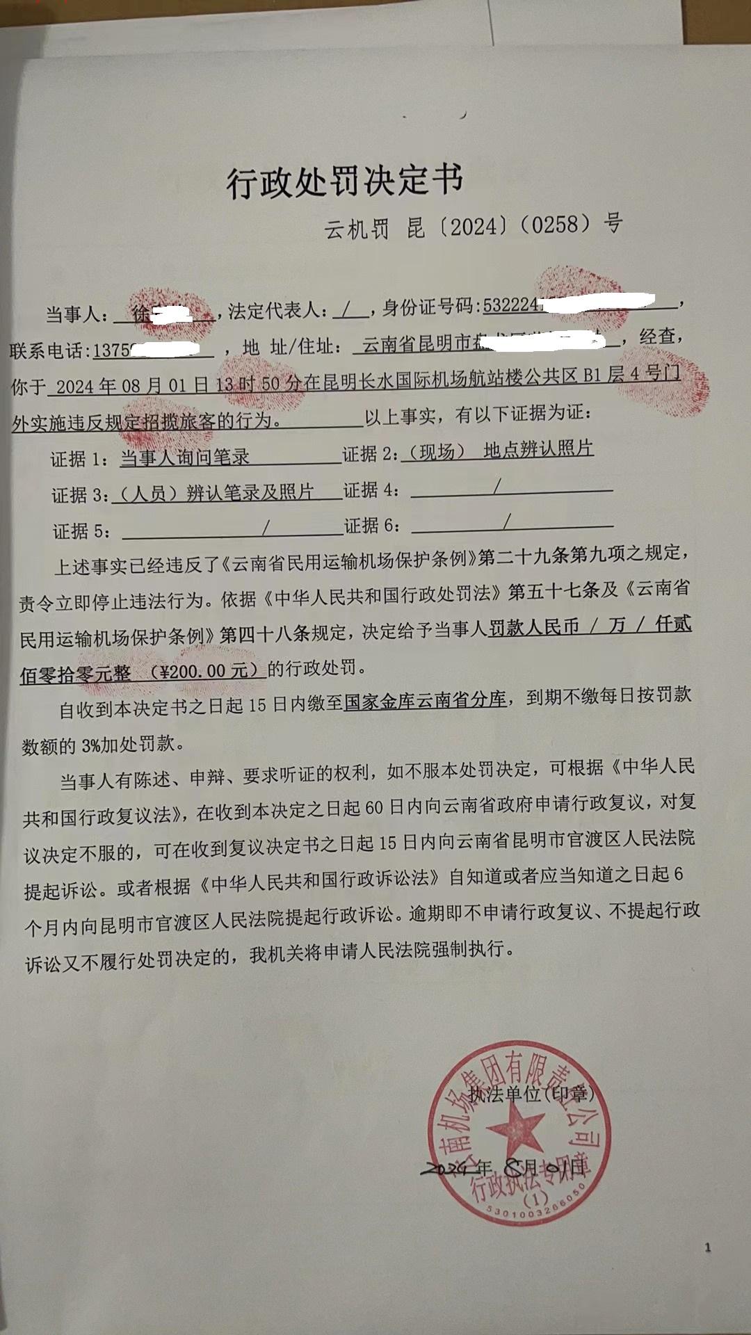 行政处罚决定书 云机罚 昆{2024} (0259)号