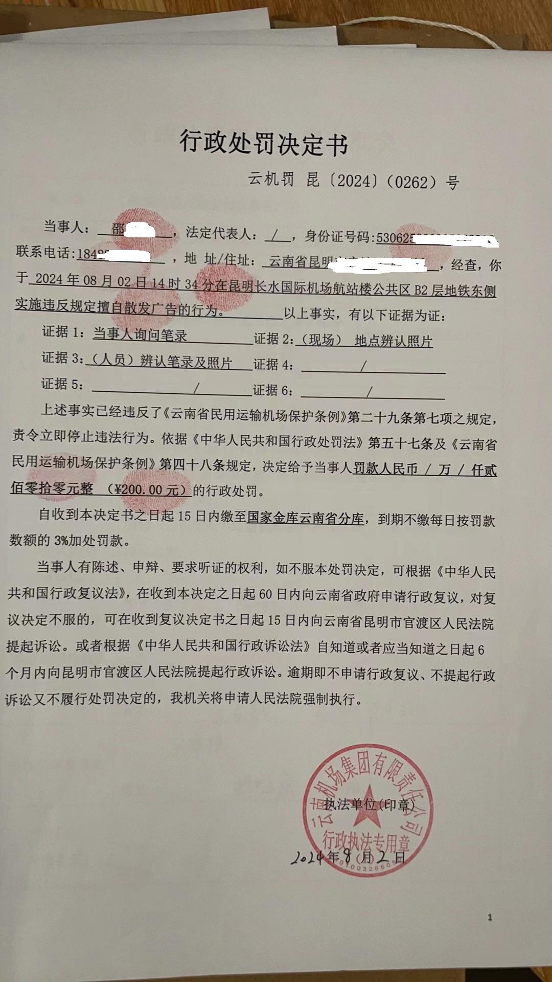 行政处罚决定书 云机罚 昆{2024} (0262)号