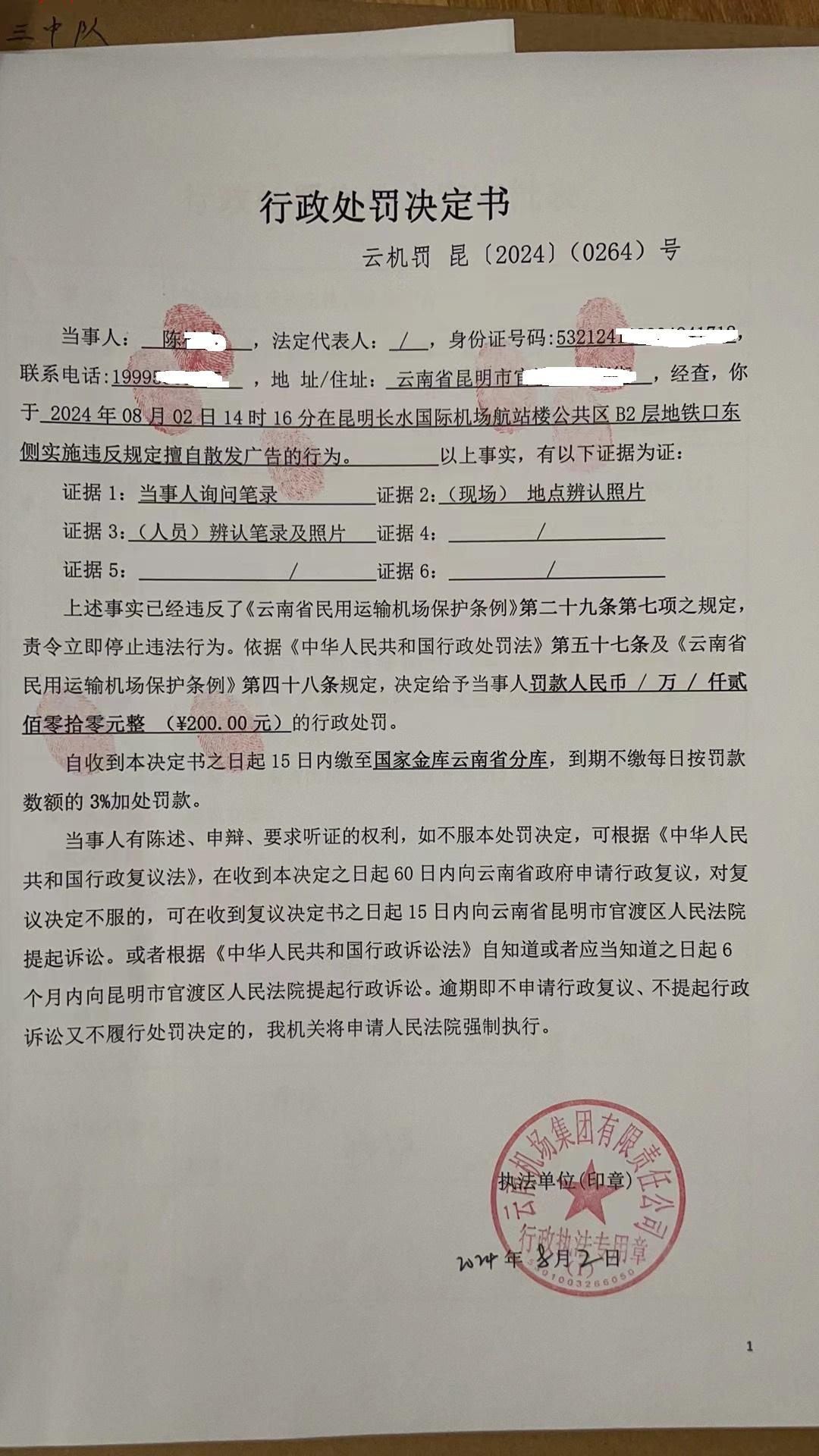行政处罚决定书 云机罚 昆{2024} (0265)号