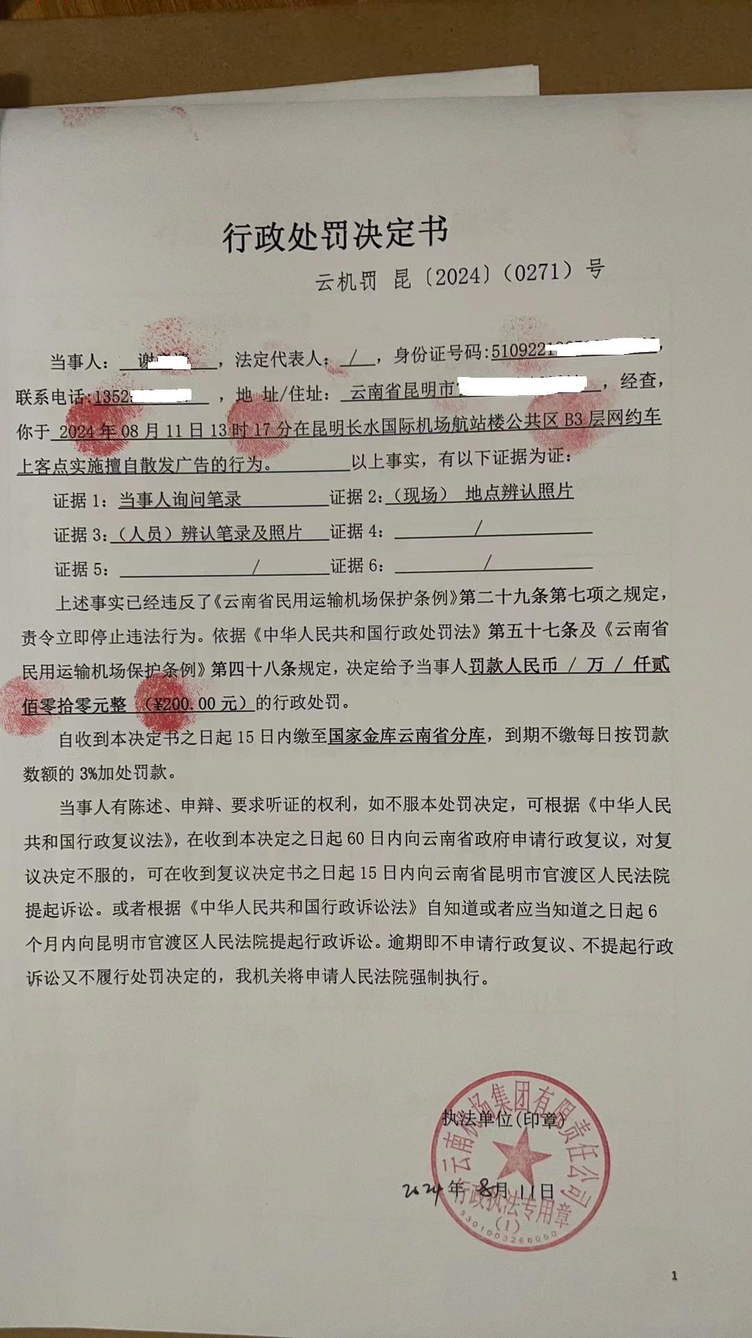 行政处罚决定书 云机罚 昆{2024} (0271)号