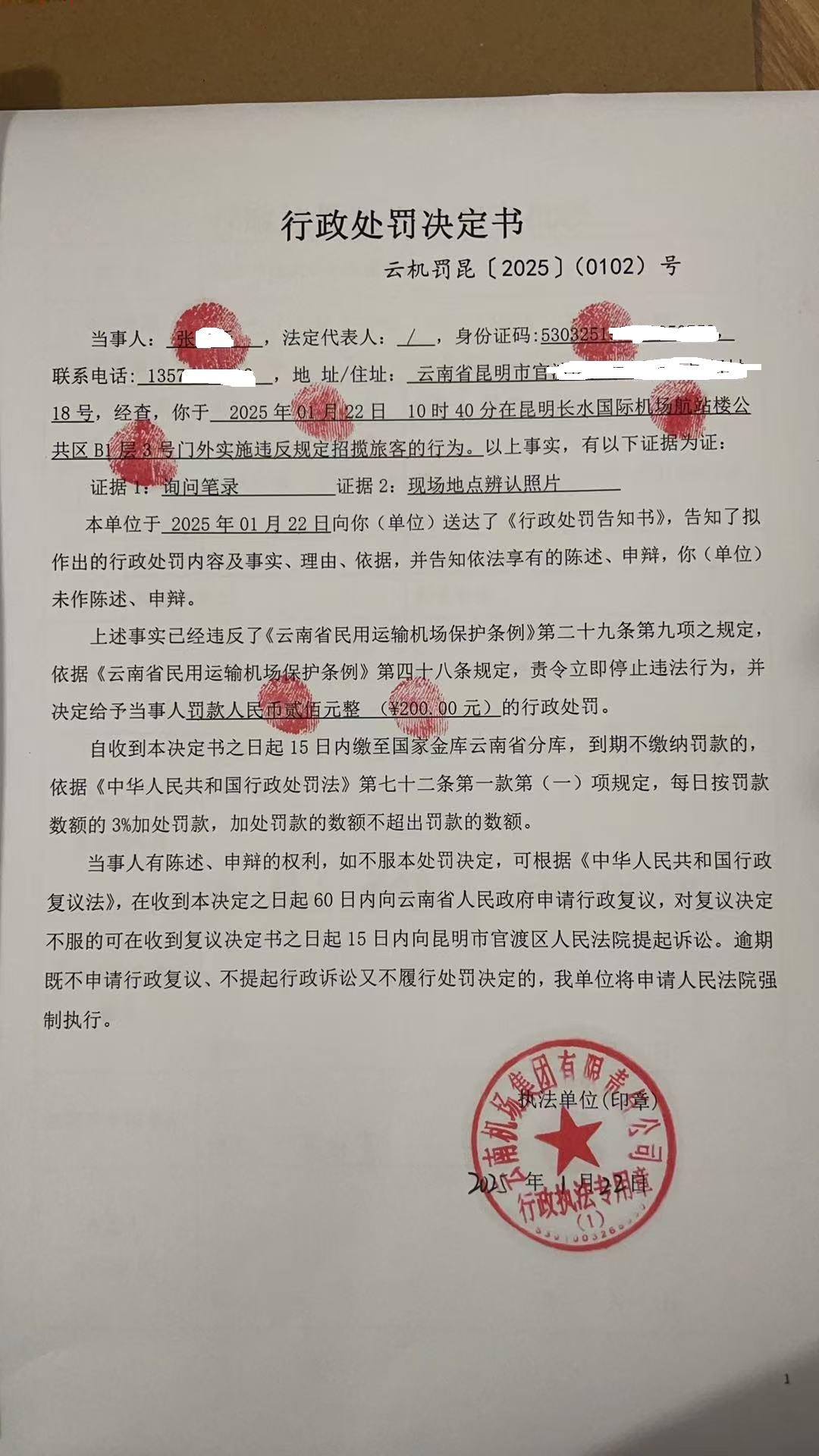 行政处罚决定书 云机罚 昆{2025} (0101)号