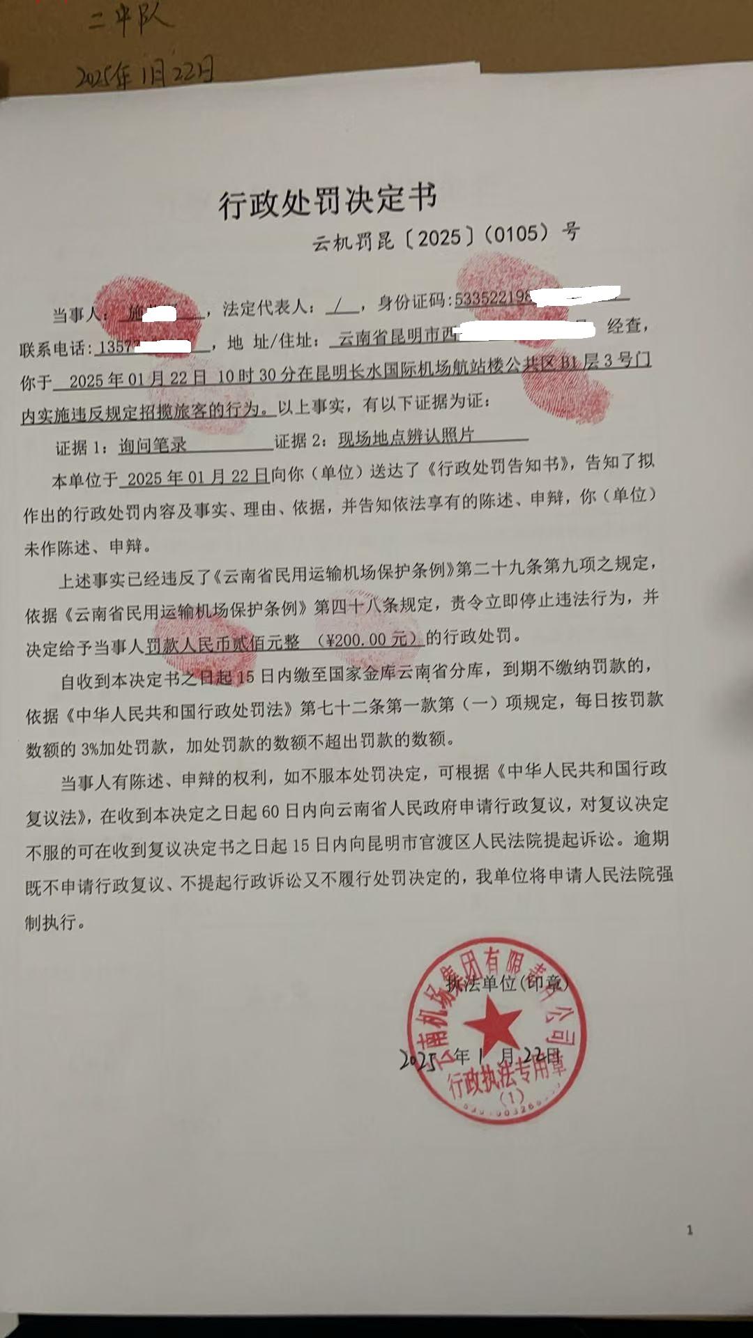 行政处罚决定书 云机罚 昆{2025} (0105)号