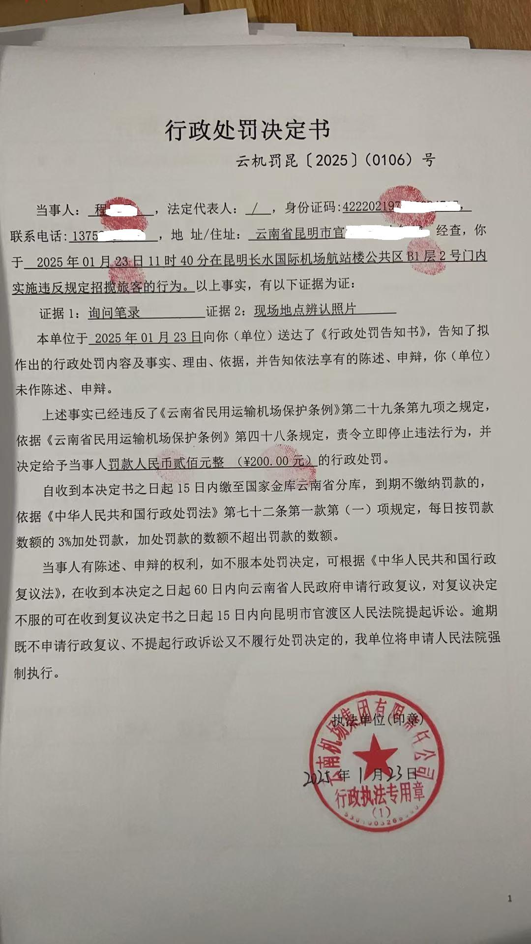 行政处罚决定书 云机罚 昆{2025} (0107)号