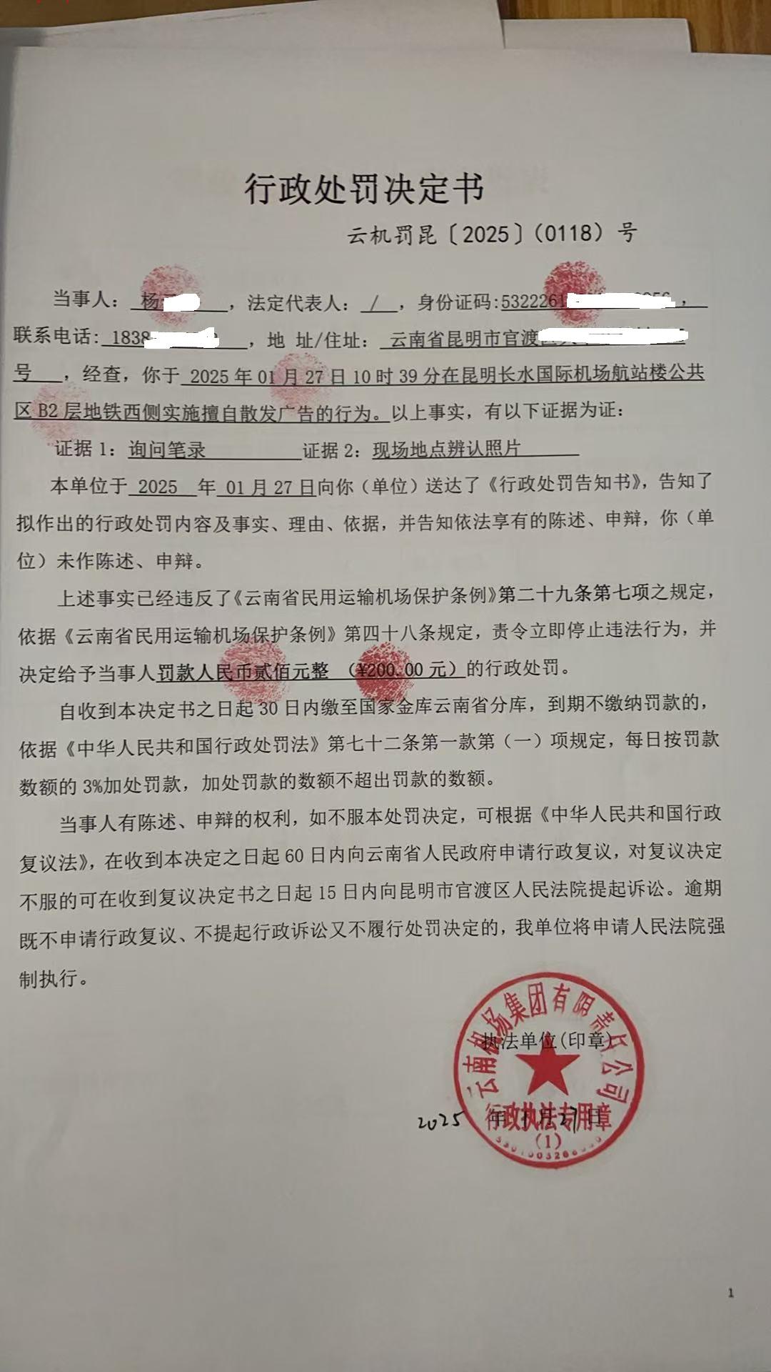 行政处罚决定书 云机罚 昆{2025} (0118)号