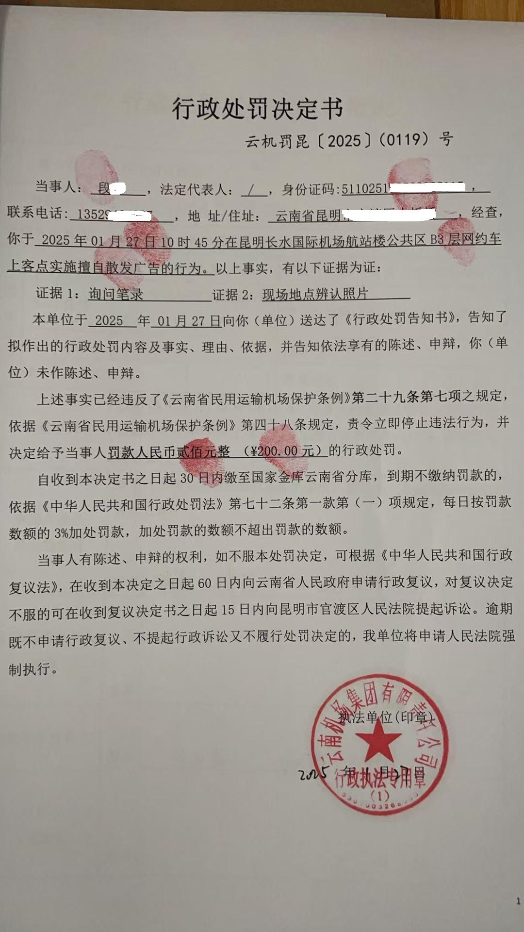 行政处罚决定书 云机罚 昆{2025} (0119)号