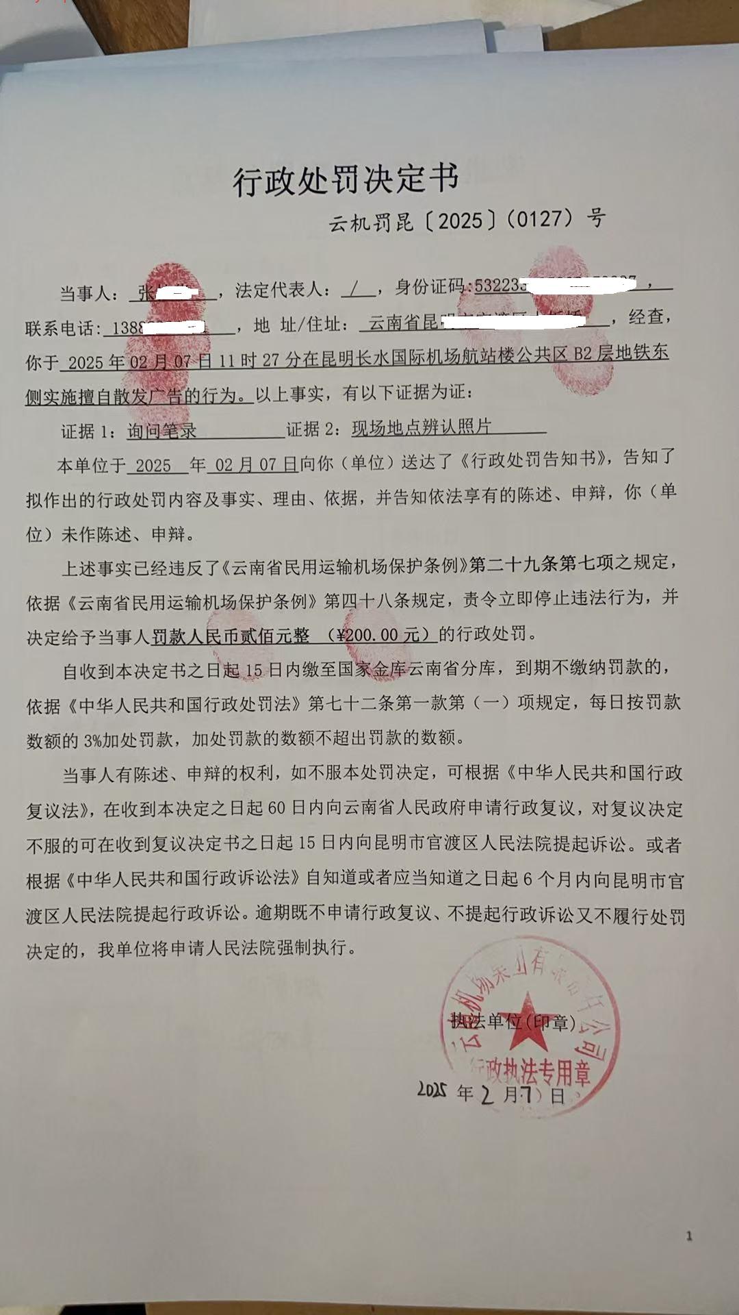 行政处罚决定书 云机罚 昆{2025} (0127)号