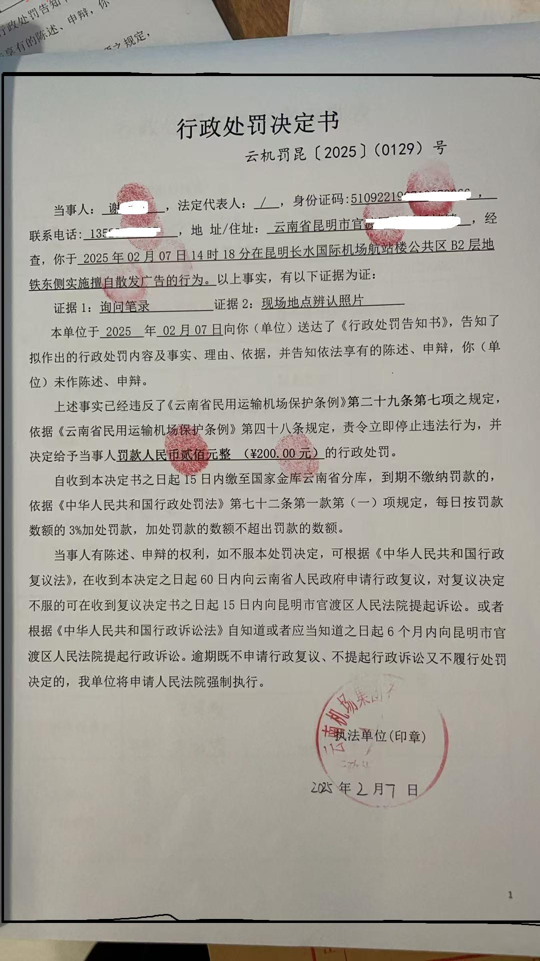 行政处罚决定书 云机罚 昆{2025} (0129)号