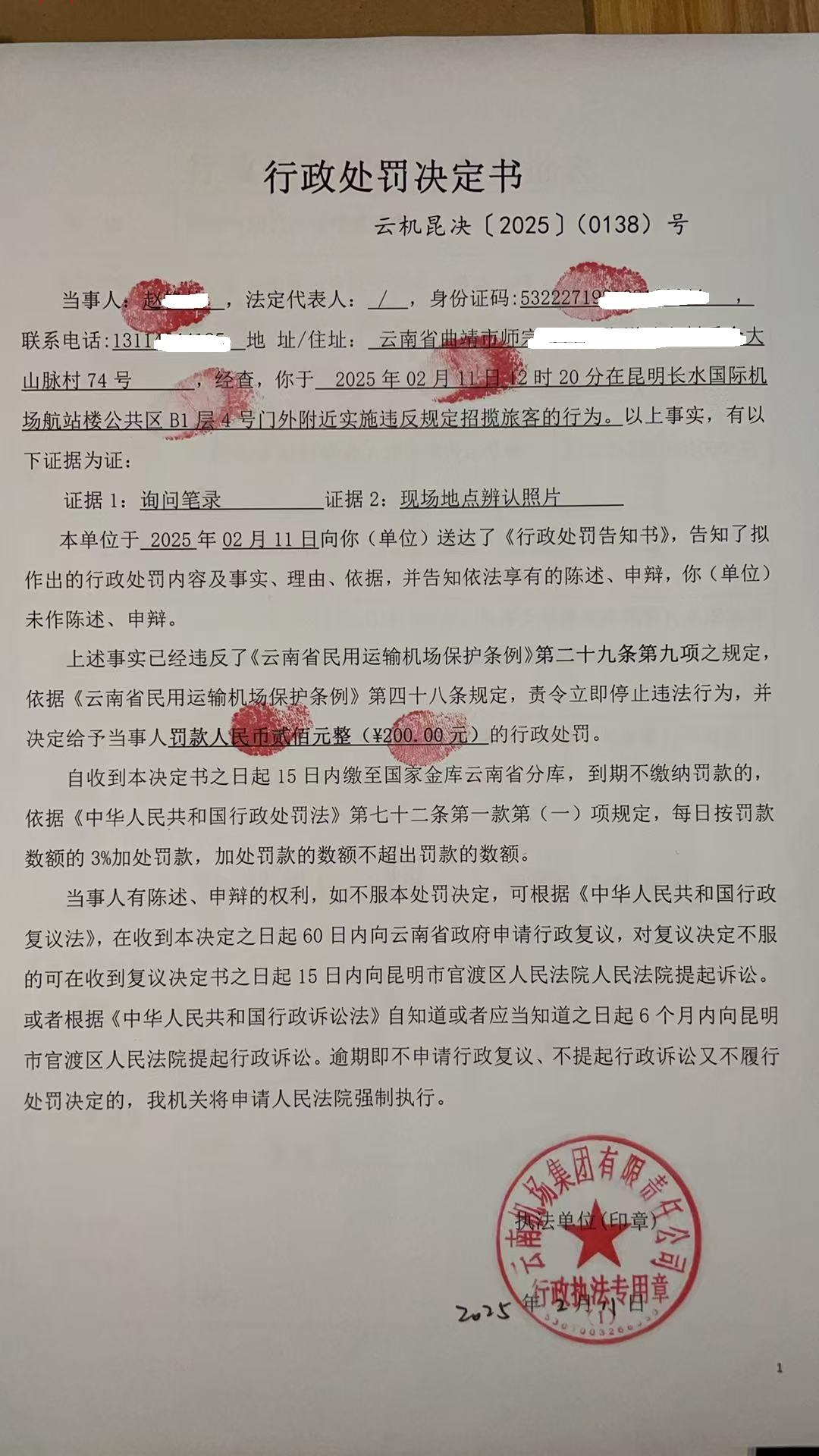 行政处罚决定书 云机罚 昆{2025} (0138)号