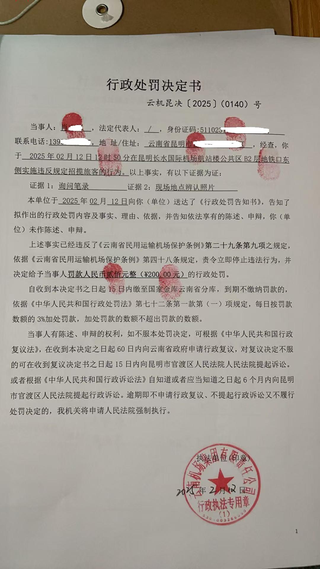 行政处罚决定书 云机罚 昆{2025} (0140)号