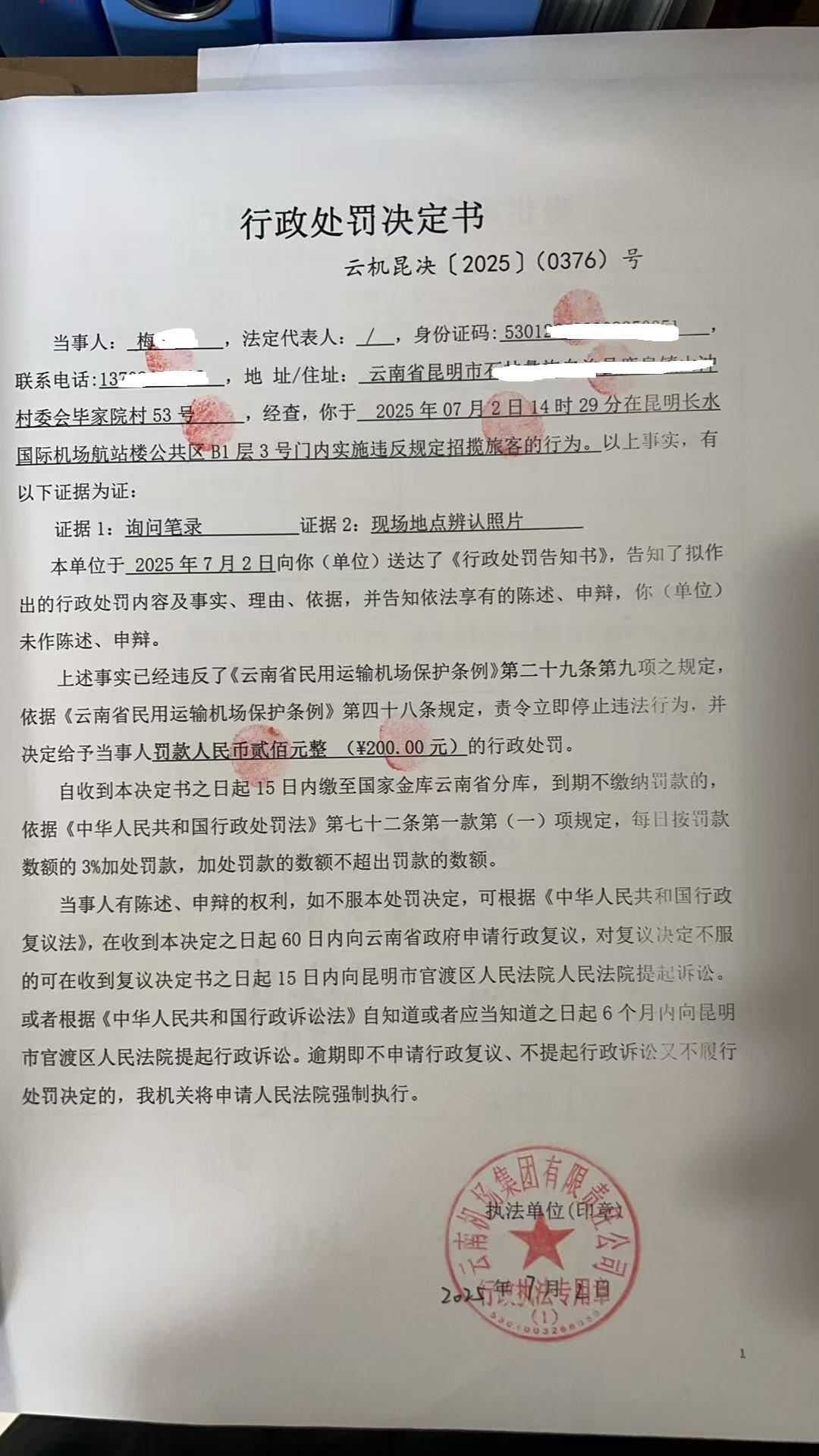 行政处罚决定书 云机昆决{2025} (0376)号