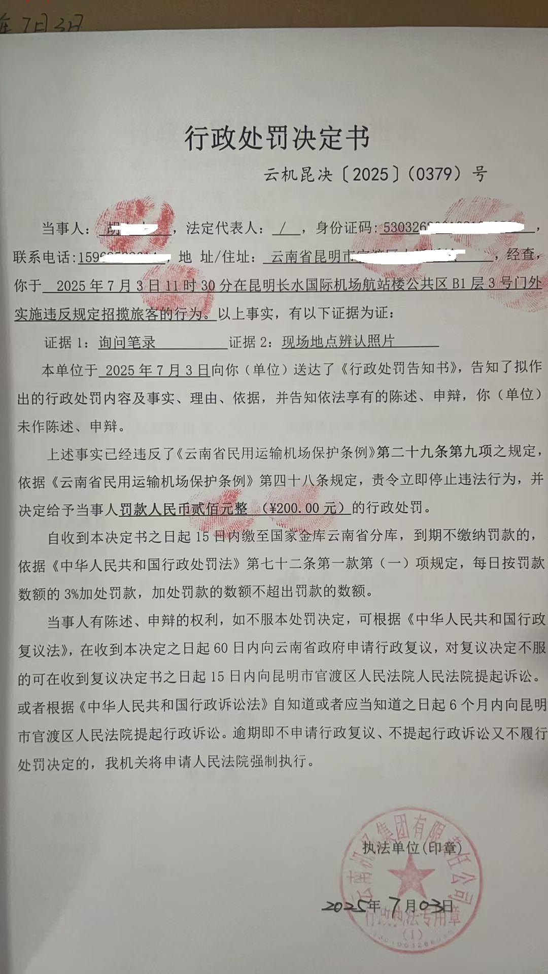 行政处罚决定书 云机昆决{2025} (0378)号