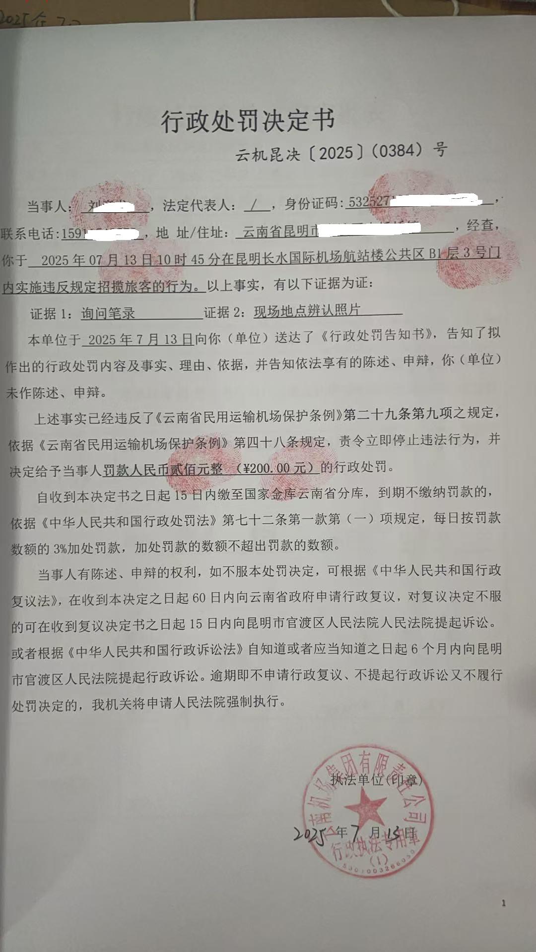 行政处罚决定书 云机罚 昆{2025} (0383)号