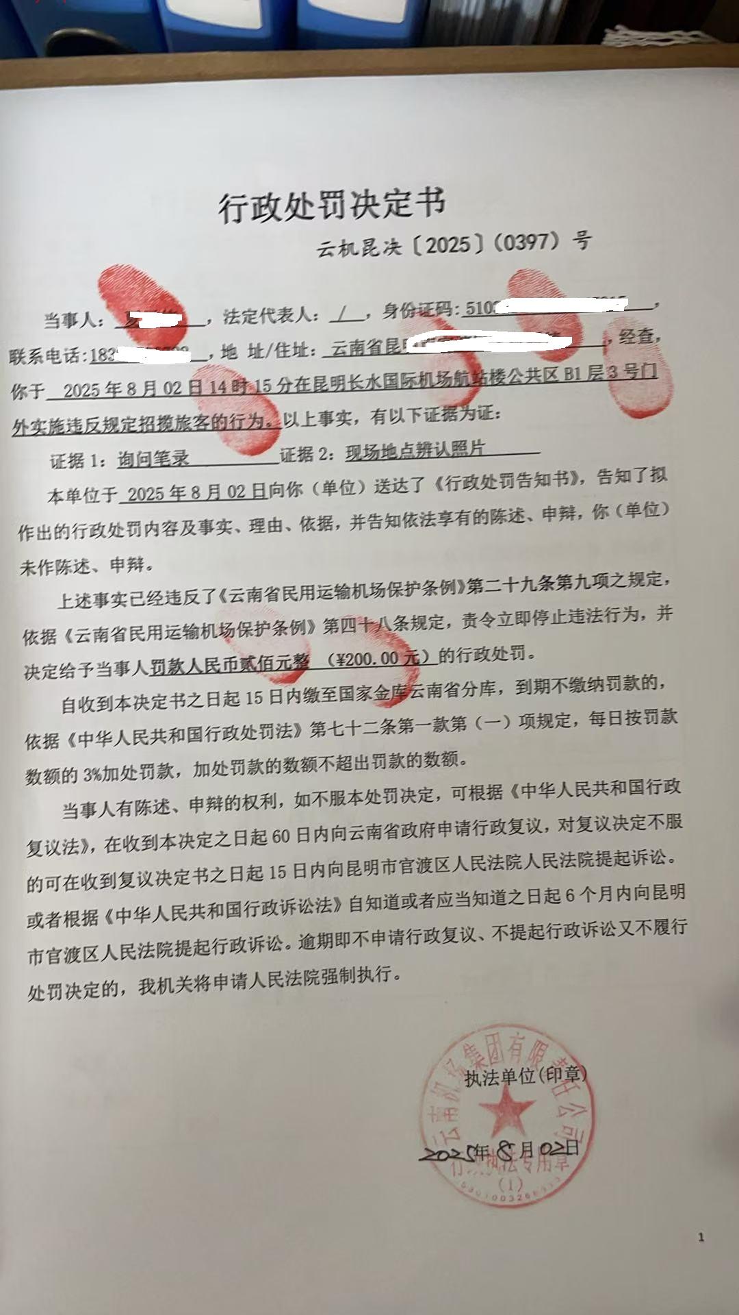 行政处罚决定书 云机罚 昆{2025} (0398)号