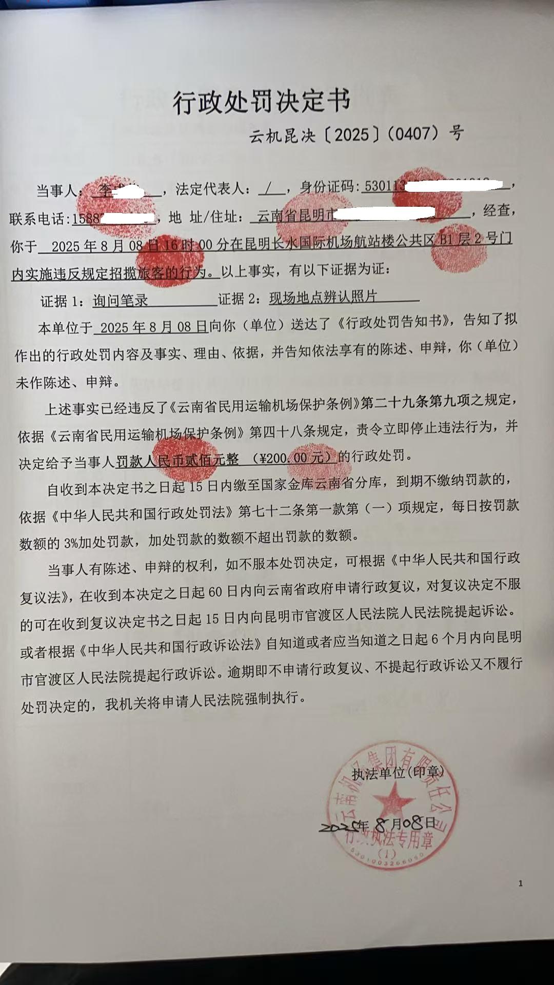 行政处罚决定书 云机罚 昆{2025} (0408)号