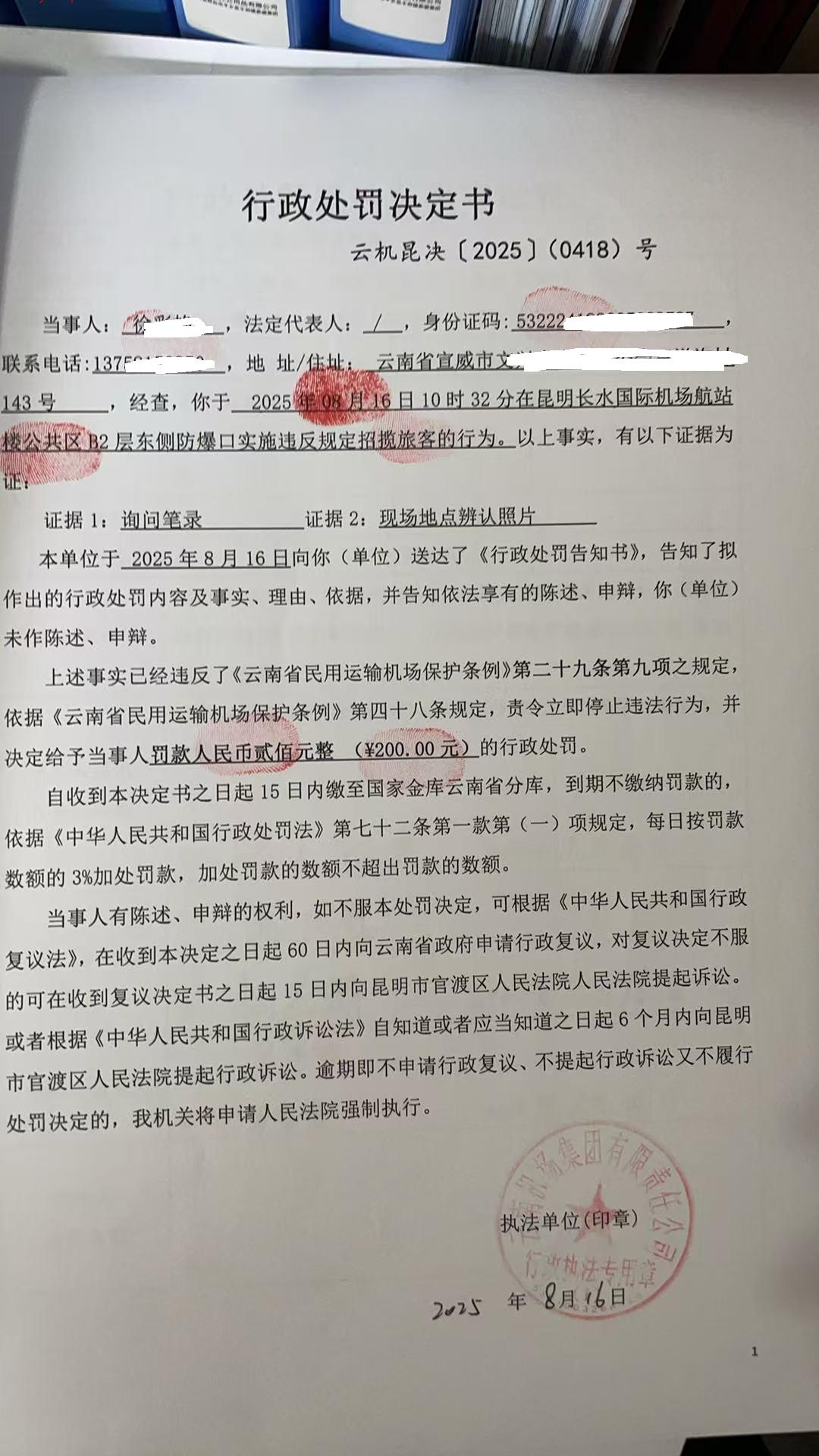 行政处罚决定书 云机昆决{2025} (0418)号