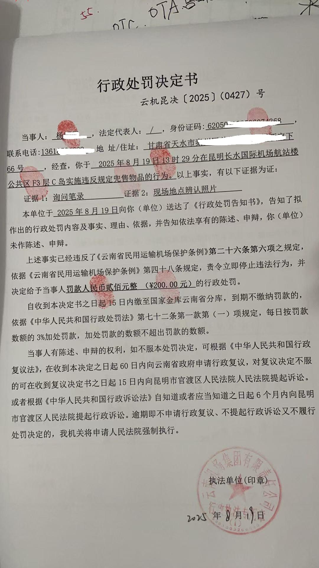 行政处罚决定书 云机昆决{2025} (0426)号