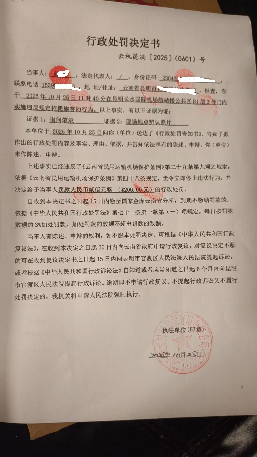 行政处罚决定书 云机罚 昆{2025} (0602)号