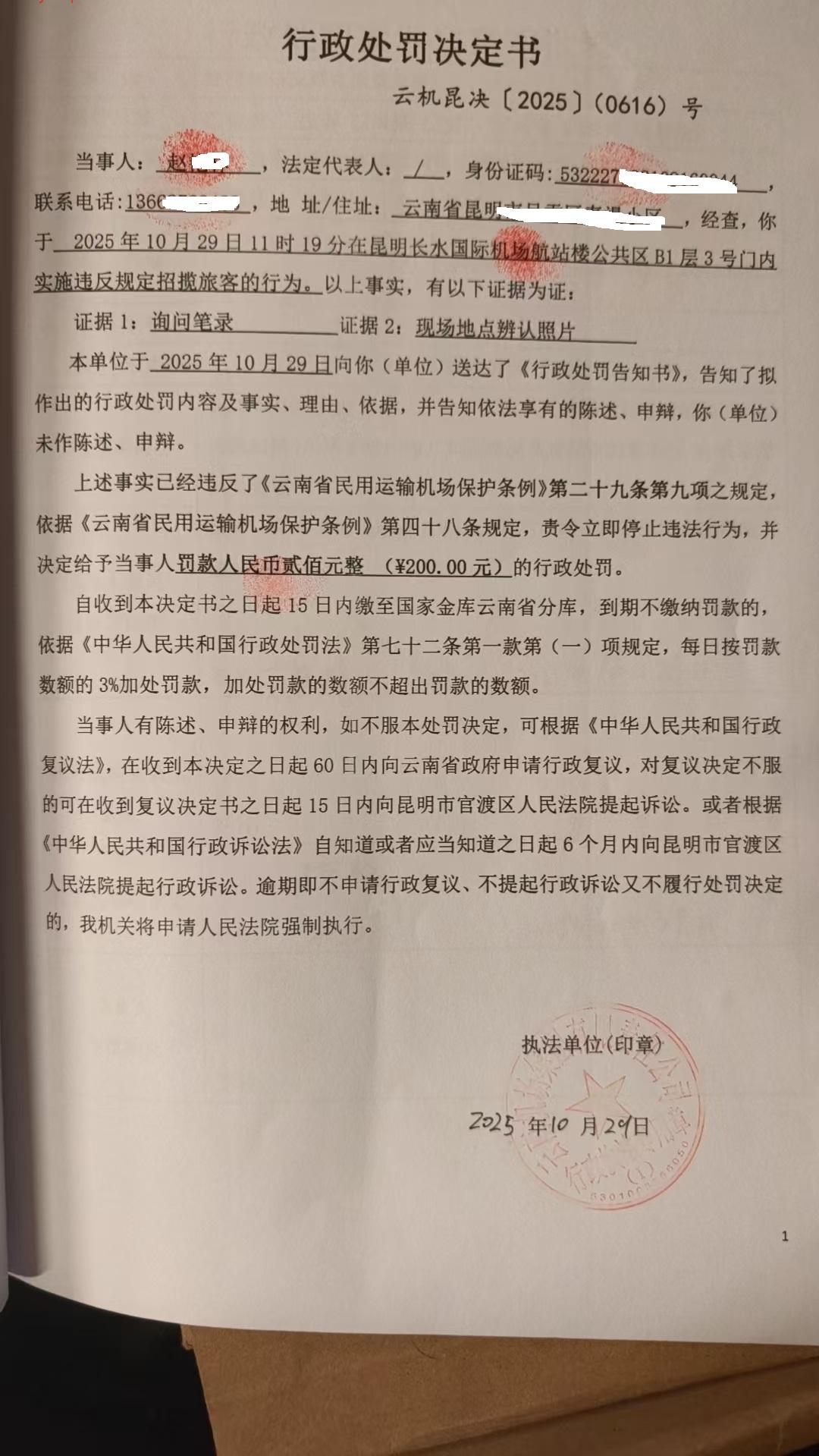 行政处罚决定书 云机昆决{2025} (0616)号