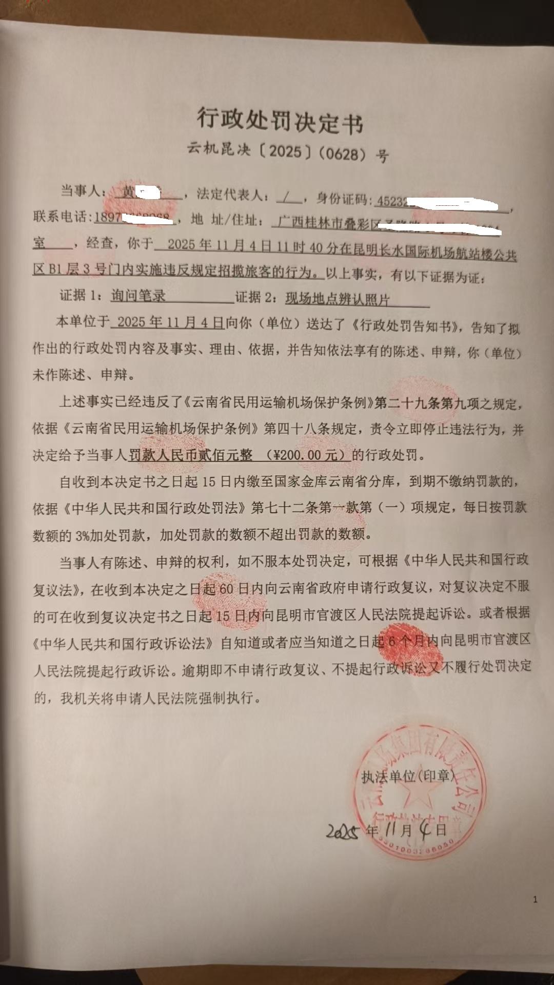 行政处罚决定书 云机昆决{2025} (0628)号