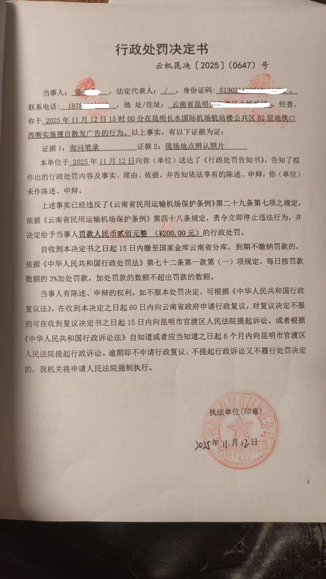 行政处罚决定书 云机昆决{2025} (0647)号