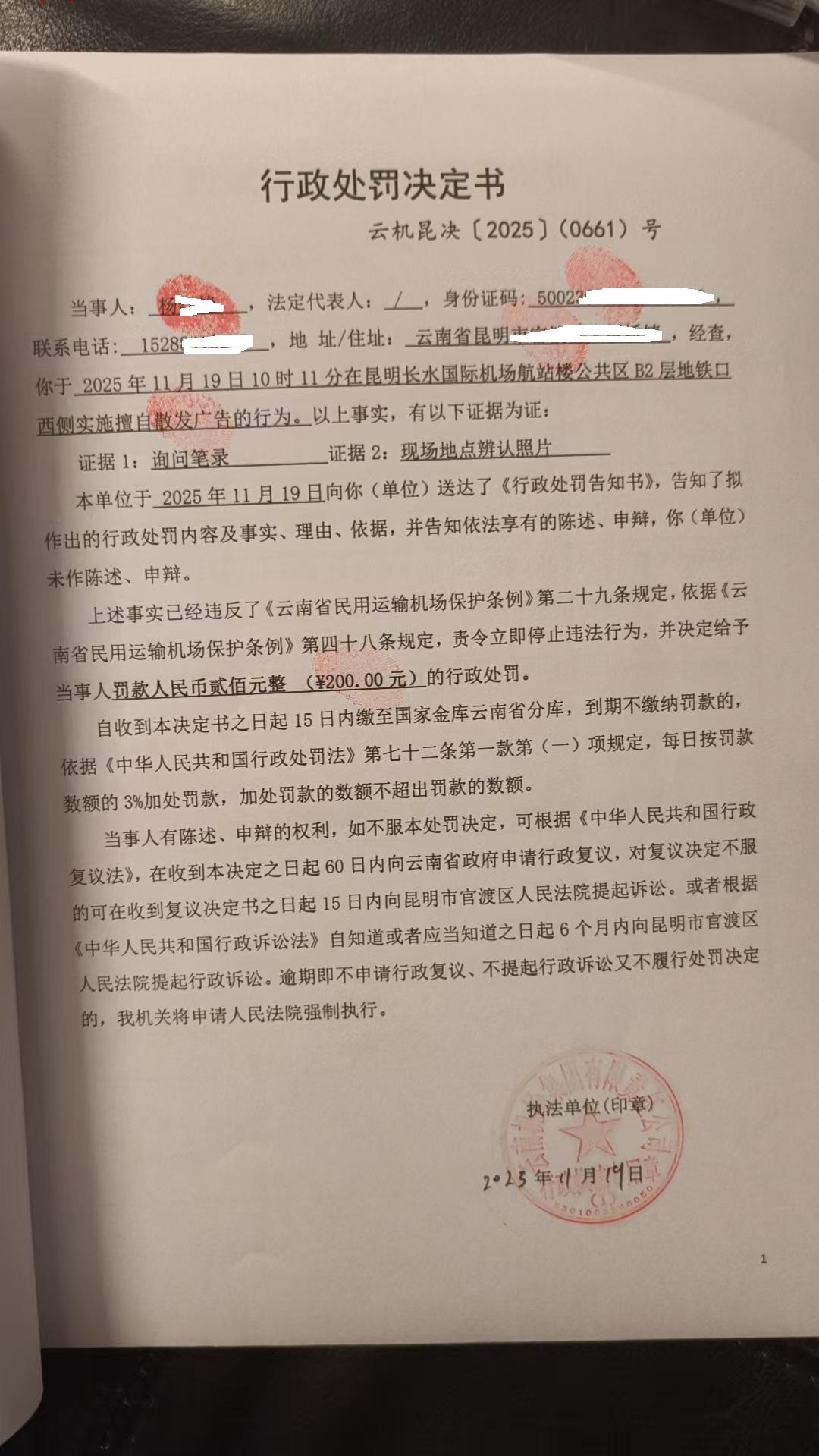 行政处罚决定书 云机昆决{2025} (0661)号