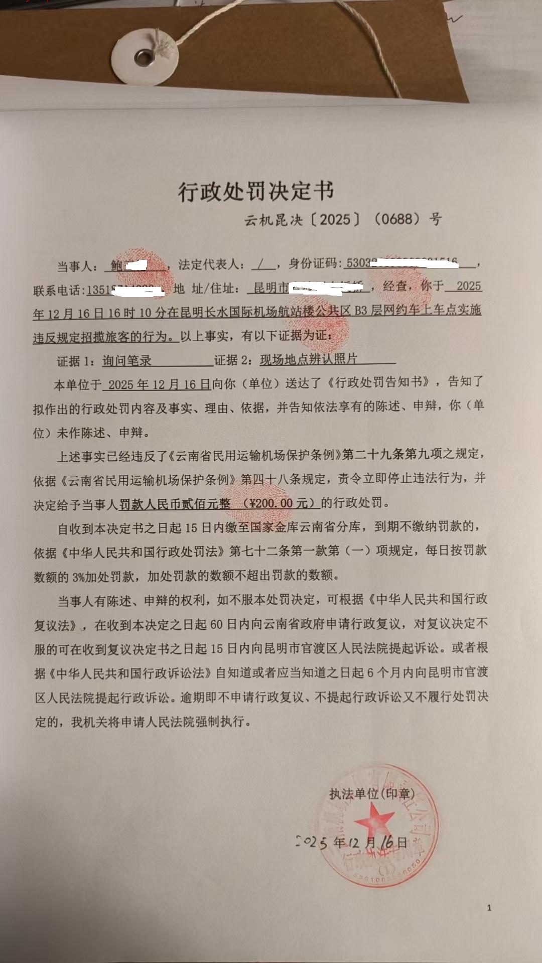 行政处罚决定书 云机昆决{2025} (0688)号